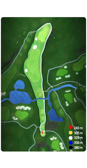 Tee 좌측 법면의 아름다운 조경 처리와 수목 식재가 인상적이며 Tee 앞 3개의 작은 연못과 2개의 폭포가 조화를 이뤄 절묘한 분위기를 자아내는 인상적인 홀로 2단 그린입니다.